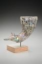 Label TextThis vessel, known as a rhyton, mimics the shape of natural animal horns originally used for drinking in antiquity. While many rhyta were made from pottery or precious metals, this example is crafted from blown glass, featuring elegant mold-impressed ribs. The vessel terminates in the head of an animal, likely a stag with stylized antlers, or perhaps even a snail. To use a rhyton, the drinker would cover the small hole at the tip of the snout with a finger while the horn was filled. Removing the finger allowed a stream of wine to flow directly into the drinker's mouth—a festive and skillful way to consume wine at banquets. Wall paintings from Herculaneum depict banqueters drinking in exactly this manner.Comparative ReferencesCf. Yacoub, M., "Les verres romains des Musées de Sfax, de Sousse et du Bardo," Bulletin Association internationale pour l'histoire du verre, no. 6, 1971-72, p. 34, no. V.1. A. v.