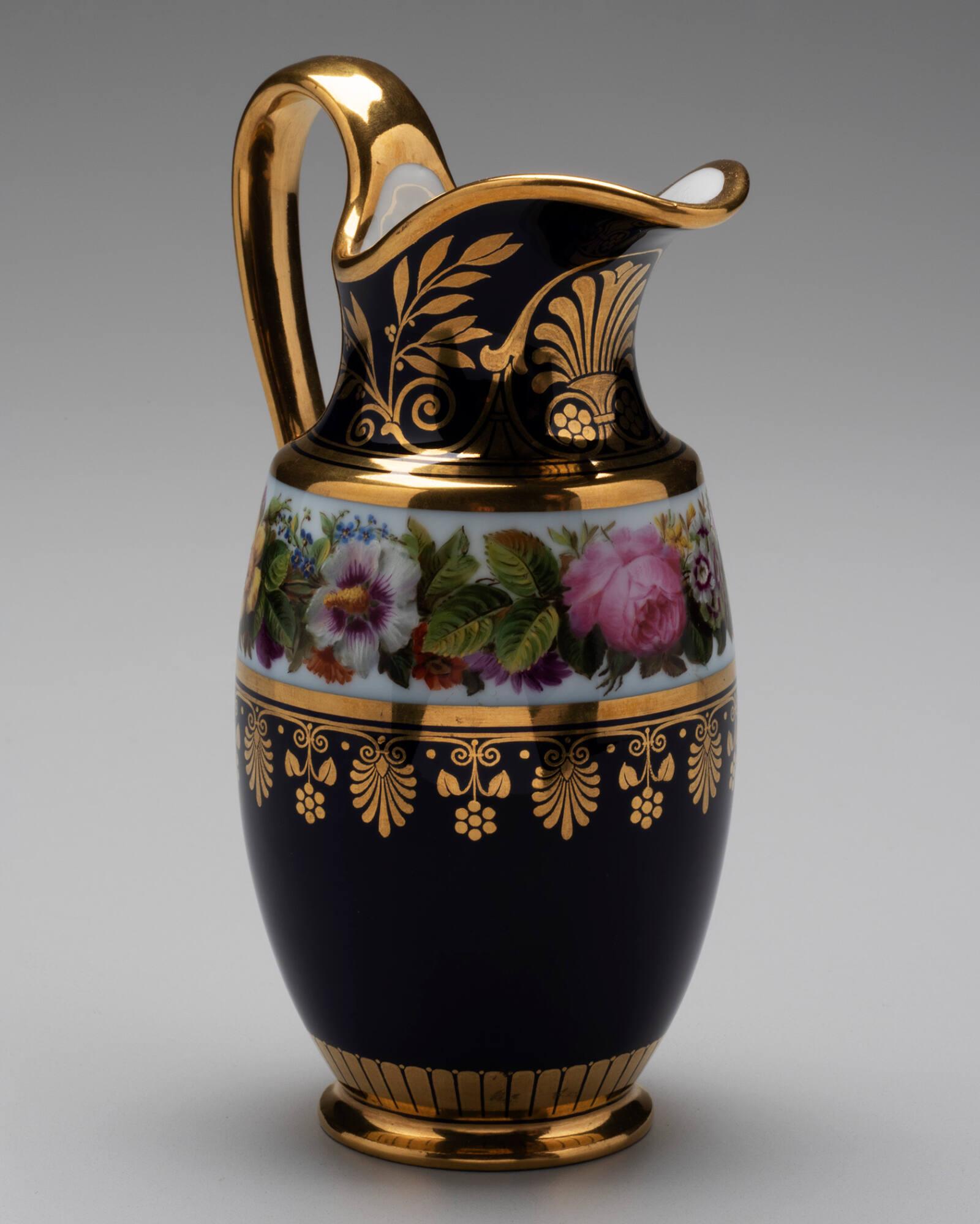 MediumPorcelain; dark blue and gold with white band decorated with closely grouped garden flowers in color. Gold handle.
