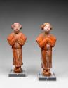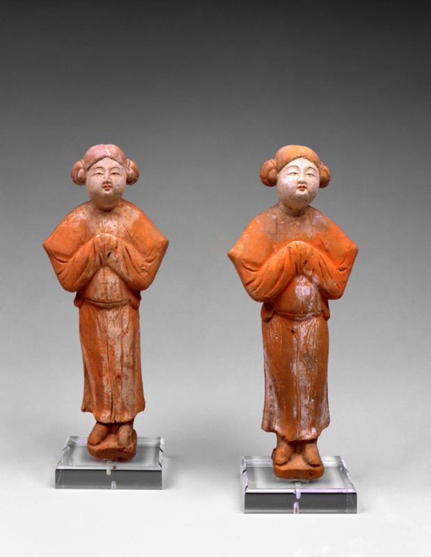 DescriptionA pair (2003.17, 2003.18) of standing female tomb figures (mingqi), each on a small square base. They are made of low-fired, orange-colored earthenware ("polychromed ceramic") and were finished with applied pigments. Traces of orange, cream, brown (for facial features), and red (for lips) pigment remain. The pigment is in a fragile, powdery condition and weakly attached. Both figures are depicted standing, wearing long, flowing gowns, with their hands folded and concealed within wide sleeves. They have full faces and elaborate hairstyles.