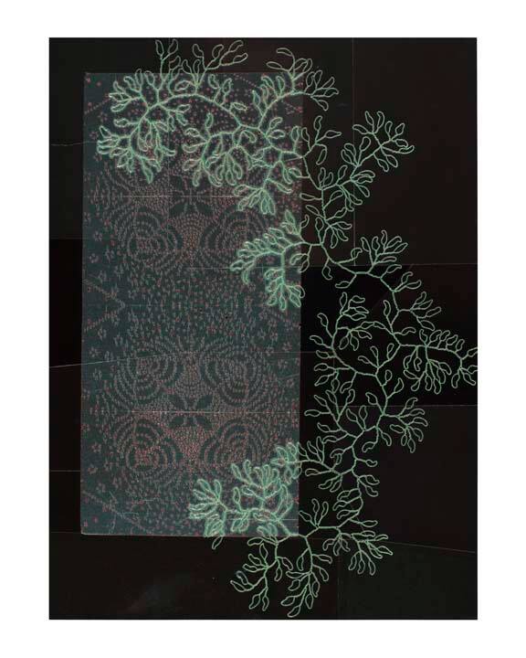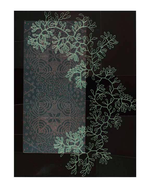 MediumWire relief on perforated plastic chine collé with mica flocking on collaged black magazine pages