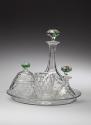 Label TextPopular in Europe from the 17th to the 19th centuries, water sets, or verres d’eau, were used to serve water sweetened with sugar and other flavors. Sugar was expensive before the second half of the 19th century, and not many could afford this sweetened beverage. Accordingly, the luxurious utensils necessary for this habit displayed the wealth of their owners. This set includes a large decanter for water, a covered sugar bowl, a small decanter for a flavored liquid such as rosewater or essence of orange flowers, and a tumbler for drinking the mixture.Published ReferencesMallett, The 19th Century, 2001, p.10.
