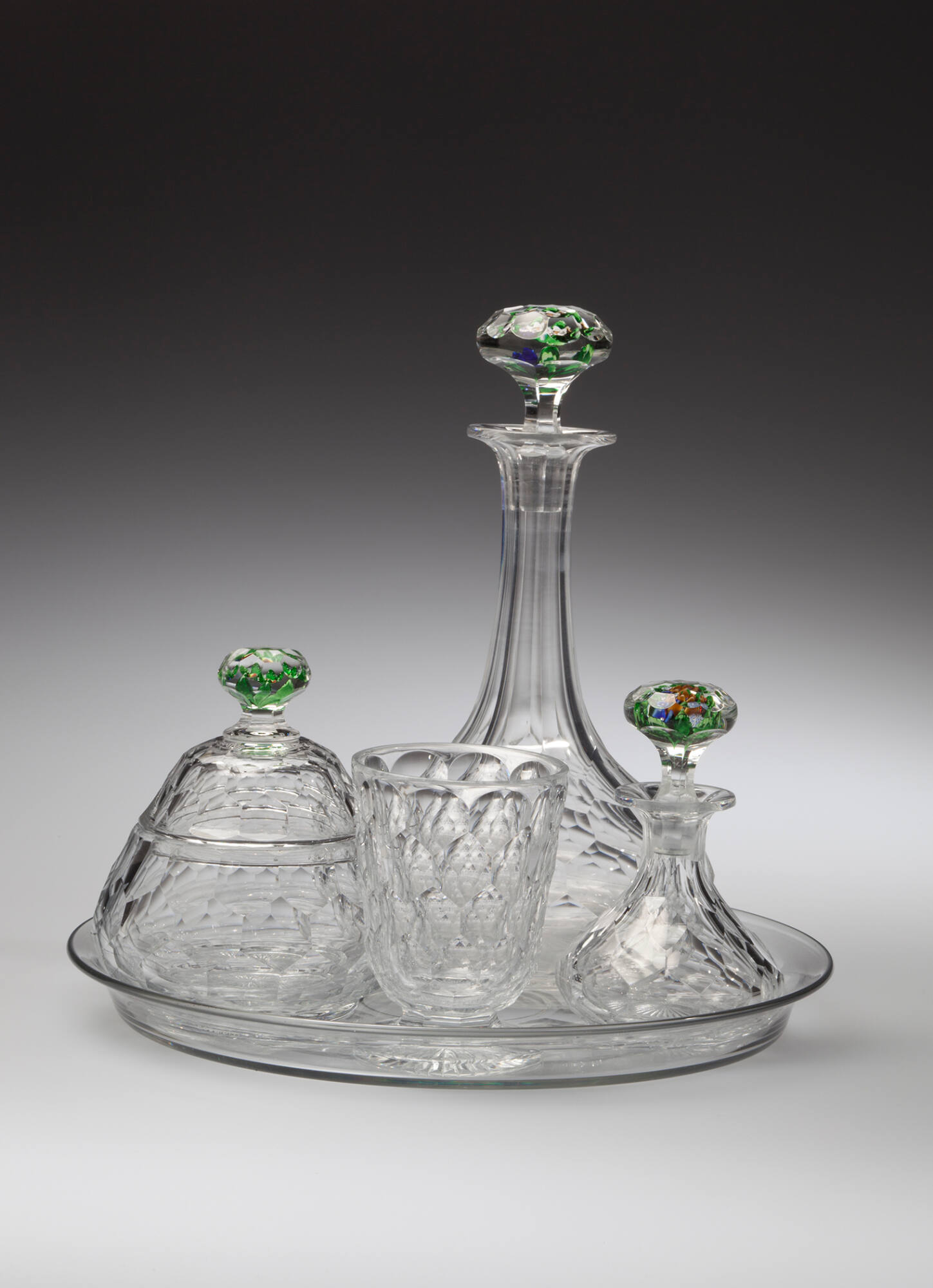 DescriptionThe 'Verres d'Eau' consists of a circular tray with a flared rim, its base cut at the reverse with shallow, radiating flutes, upon which rests a large and a small decanter, a covered bowl and a footed tumbler, all decorated with large hexagonal facets in the so-called nid d'abeilles or honeycomb pattern. Their bases are cut in the center with a star. The two carafe stoppers and the finial of the sugar bowl cover are each enclosing a lampworked bouquet of polychrome flowers.