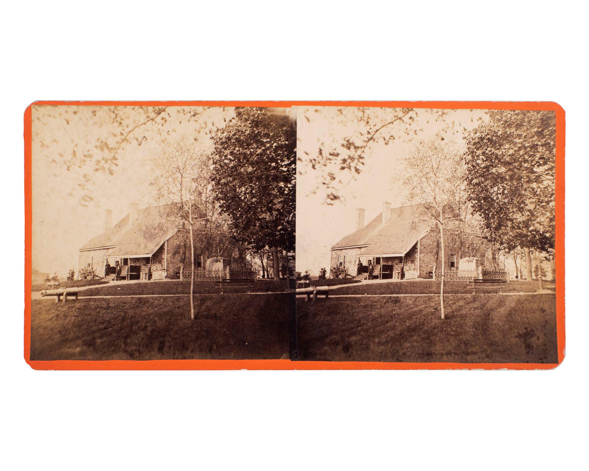 Masonry (faced stone) building with cast iron fence and cannon. Four men present.