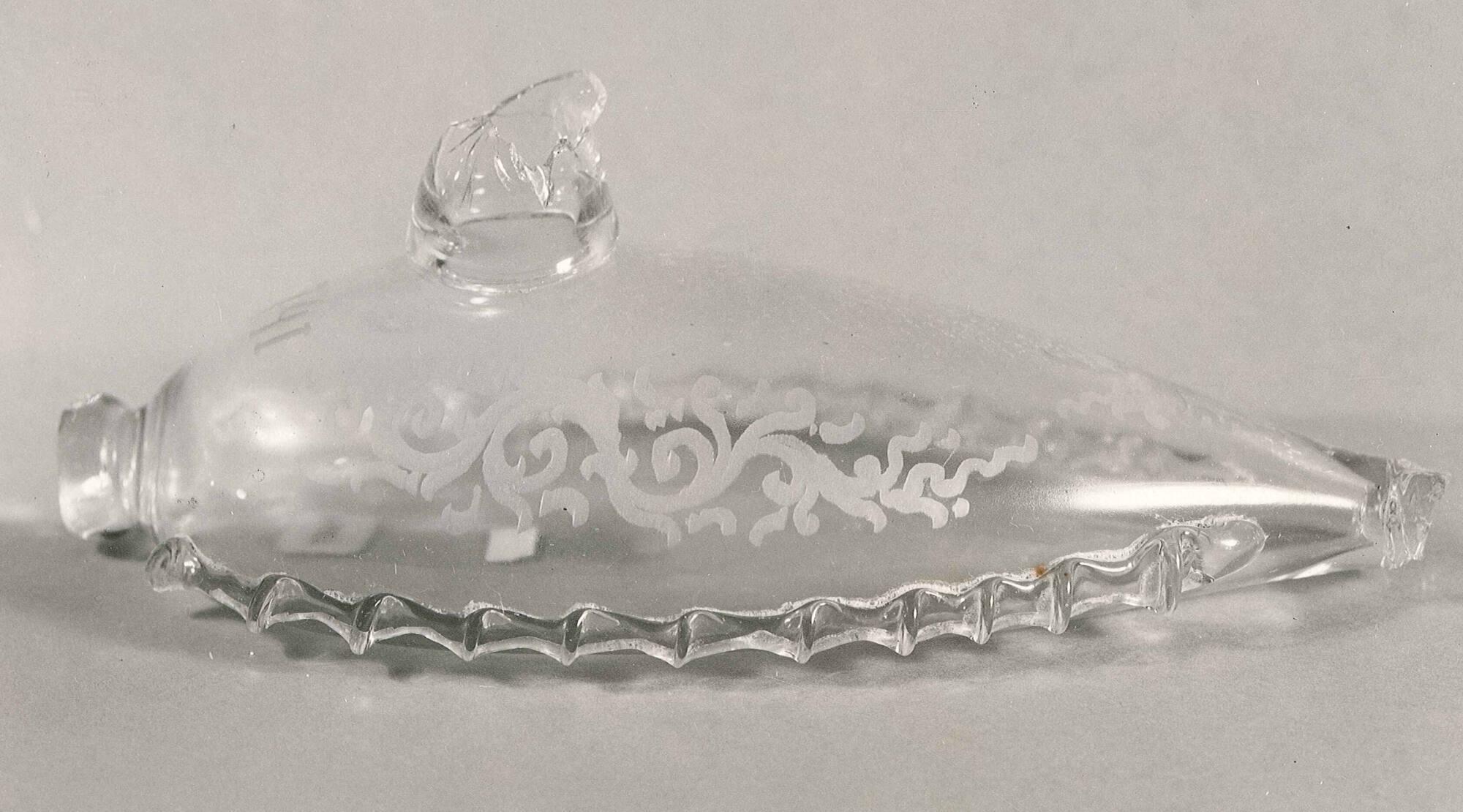 DescriptionBlown. Bellows-shaped bottle to hang on wall. Etched ornamentation and date "1741". Clear glass.