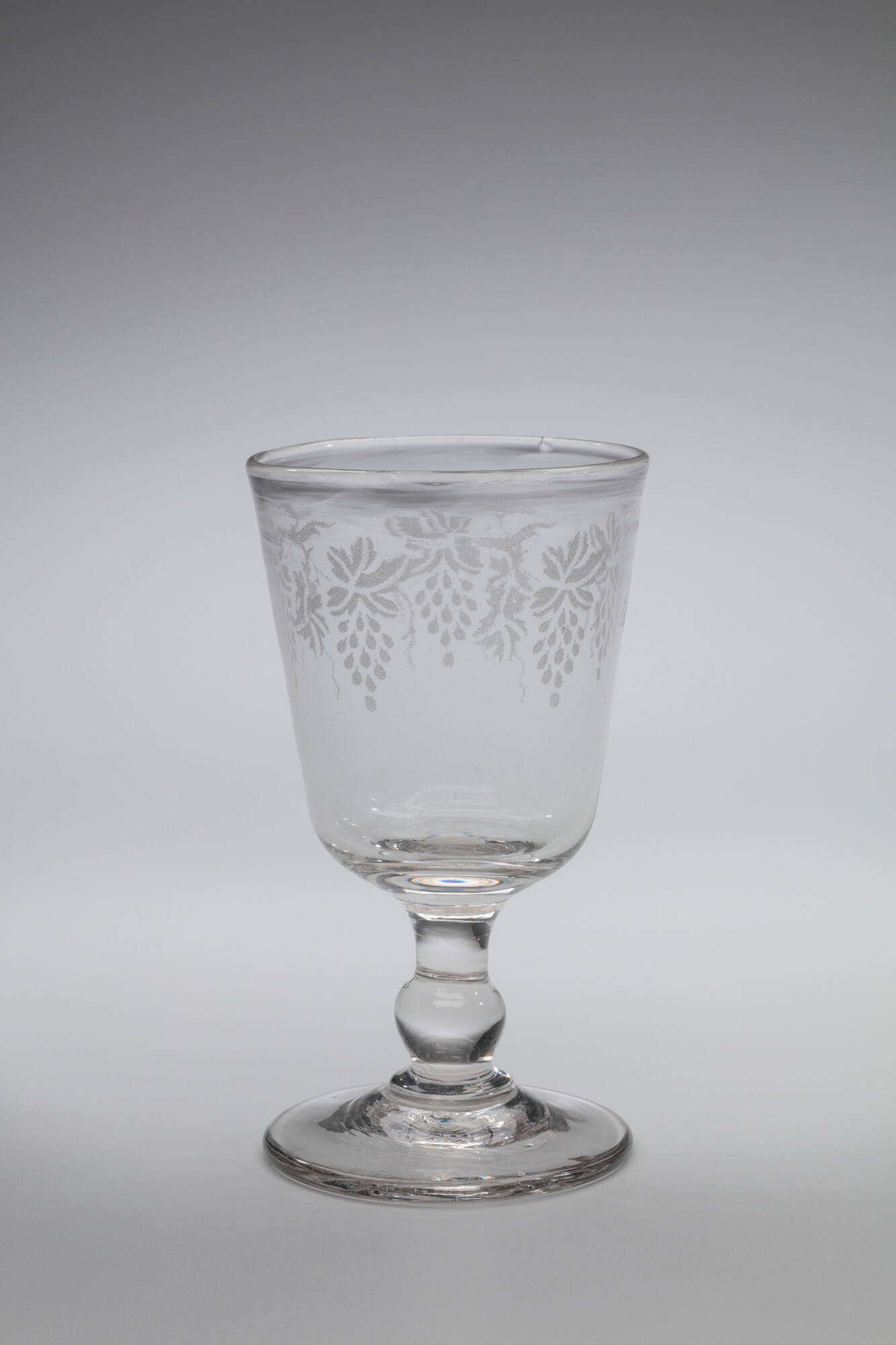 DescriptionEtched grape cluster design on colorless glass