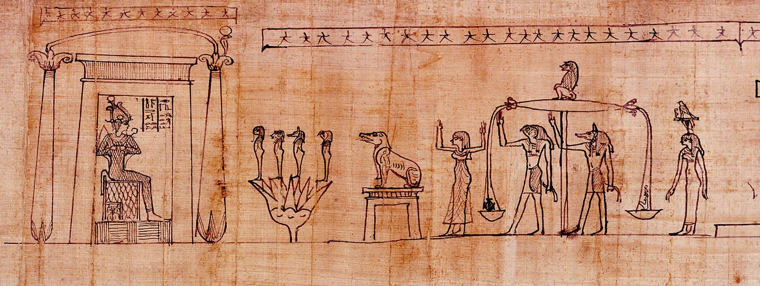 DescriptionA long scroll comprised of 25 sheets of papyrus pasted end-to-end. The surface is inscribed with black ink in six columns of hieratic script reading right to left, interspersed with line drawings in an outline style. The visual sequence moves from right to left, beginning with a standing female figure before a gate, followed by a reclining mummy, three columns of text regarding mummification and offerings, and a long register depicting forty-two seated deities (Judges of the Dead) in the Hall of Double Truth. The final scene on the left depicts the Weighing of the Heart ritual, featuring the scales, the deceased, and the deities Maat, Horus, Anubis, Thoth, Osiris, and the devourer Ammit.