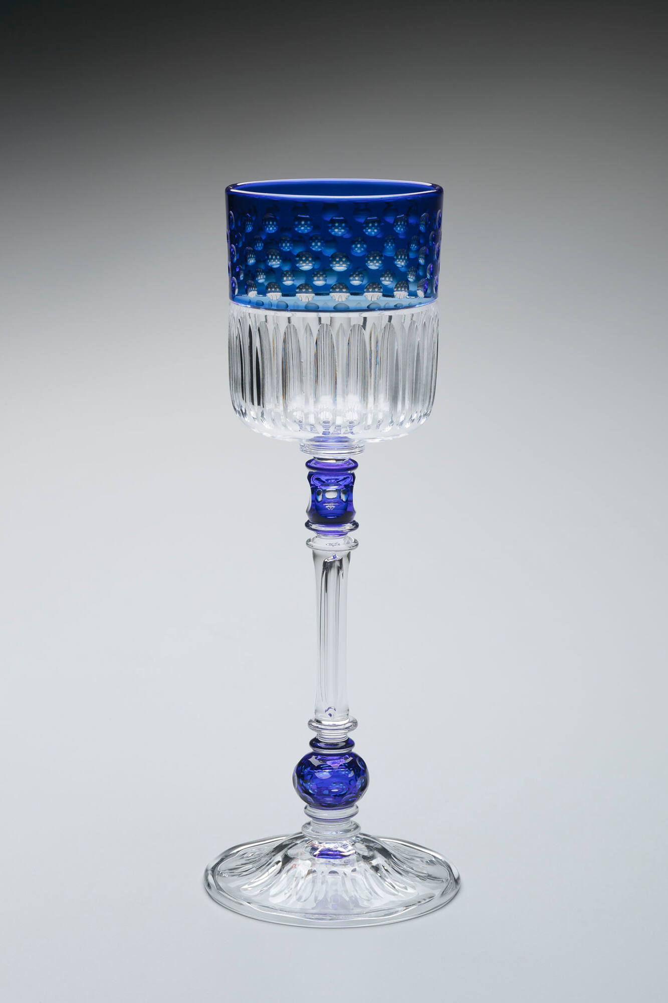 MediumColorless and blue glass; blown, cut.