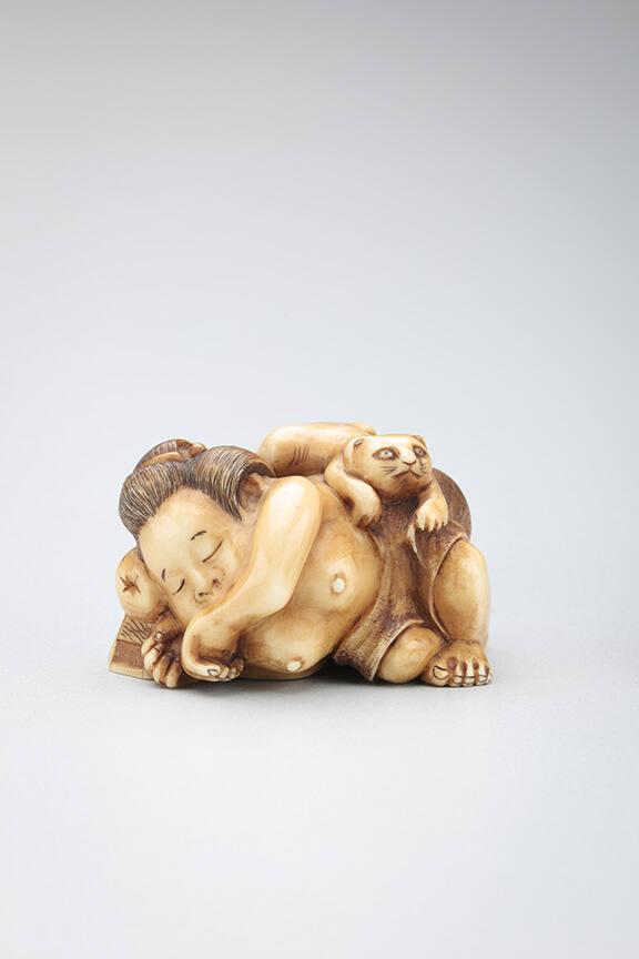 Netsuke: Okame (Goddess of Mirth) sleeping with a cat