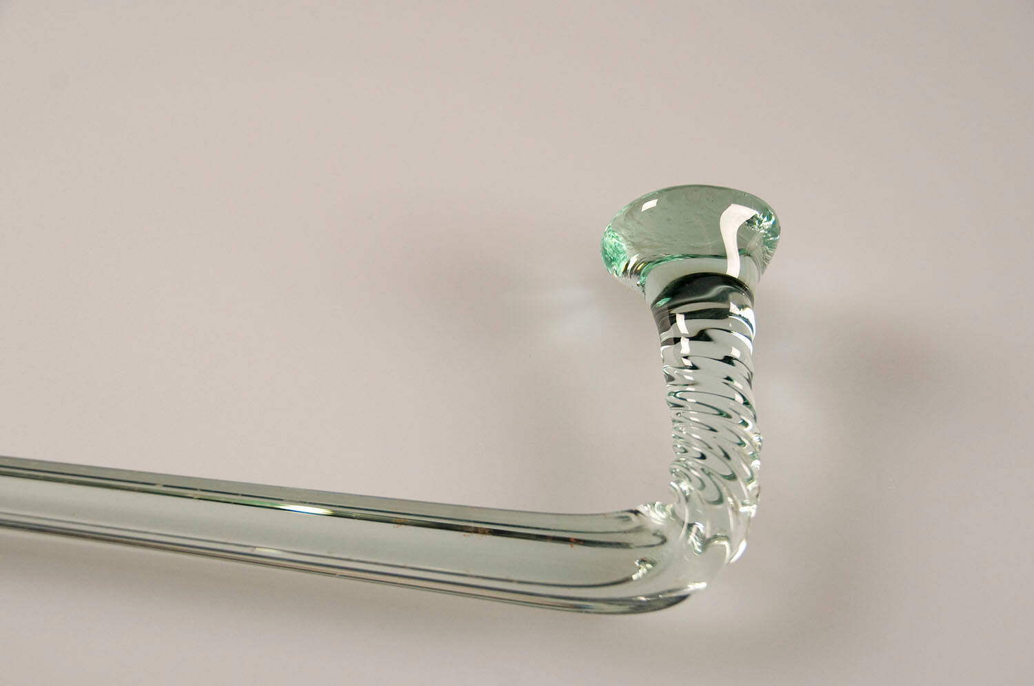 DescriptionPale green with twisty bottom and perpendicular handle; broken tip - knob perpendicular handle.
