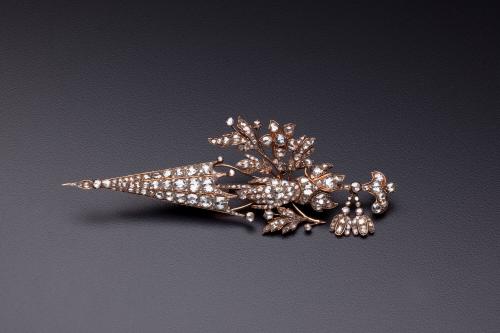 DescriptionComposed of 188 rose cut diamonds, sometimes referred to as Holland roses, this whimsical brooch depicts a gloved hand holding a floral branch and a closed parasol with tassels hanging from its handle.