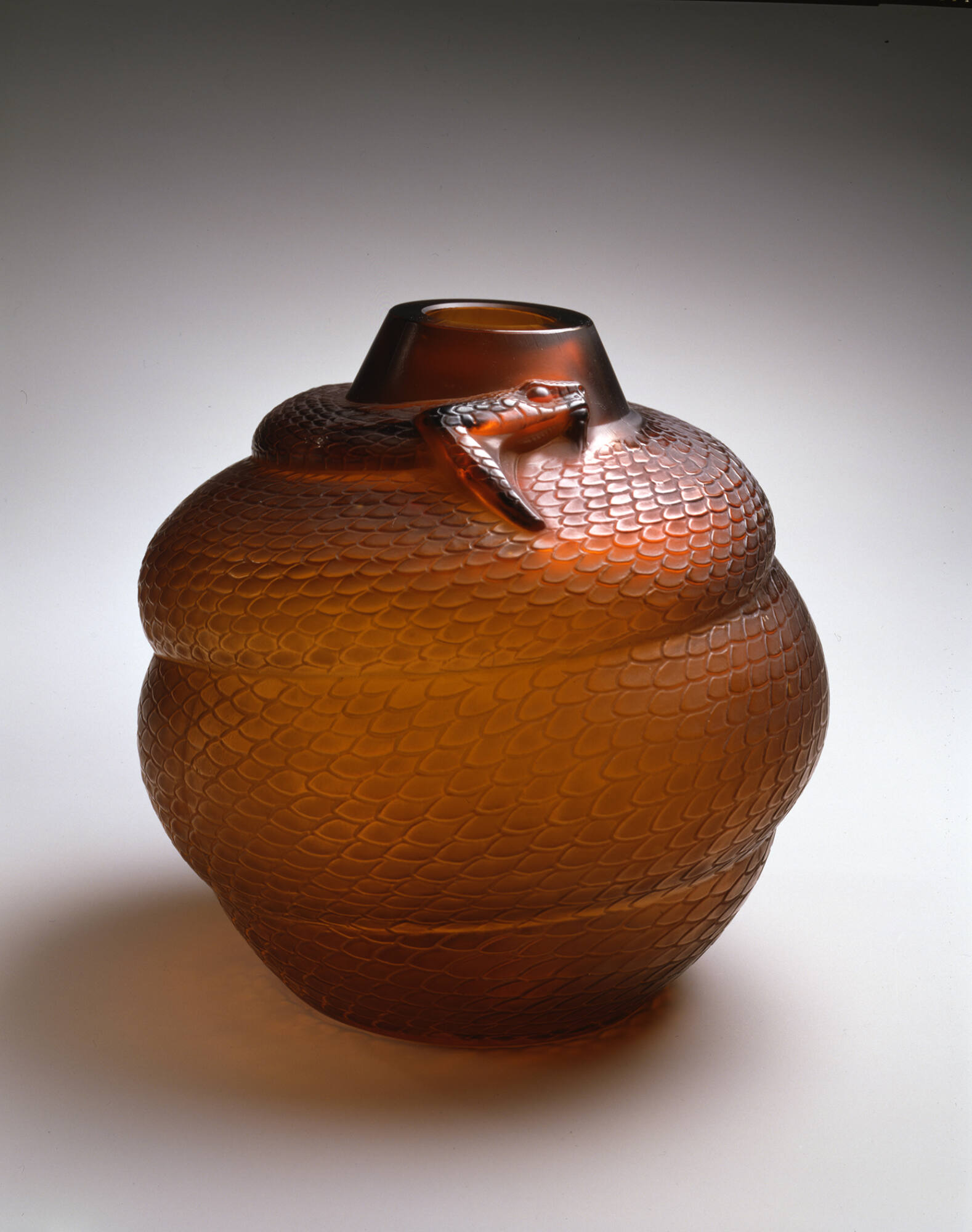 Label TextBy 1929, René Lalique was established as an artistic leader of glass in the Art Deco style. The term was abbreviated from the French words Arts Décoratifs taken from the title of the 1925 Paris exhibition L’Exposition Internationale des Arts Décoratifs et Industriels Moderne (International Exhibition of Modern Decorative and Industrial Arts). At that seminal exhibition, Lalique presented the massive Serpent vase of vibrant orange-brown glass, which caused nearly as much a sensation at the time as his famous glass fountain in the Perfume Pavilion.Published ReferencesPage, Jutta-Annette, The Art of Glass: Toledo Museum of Art, Toledo, Ohio, Toledo Museum of Art, 2006, p. 176-177, repr. (col.) p. 176.René Jules Lalique