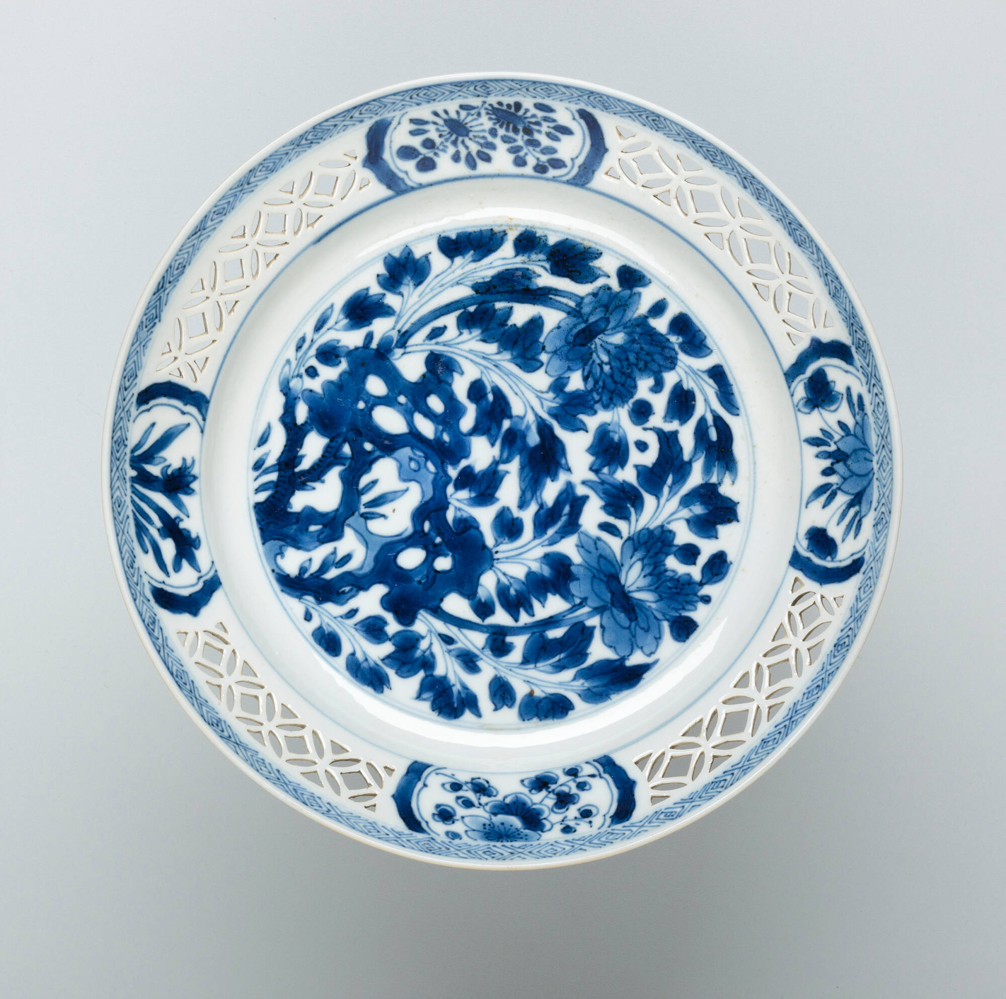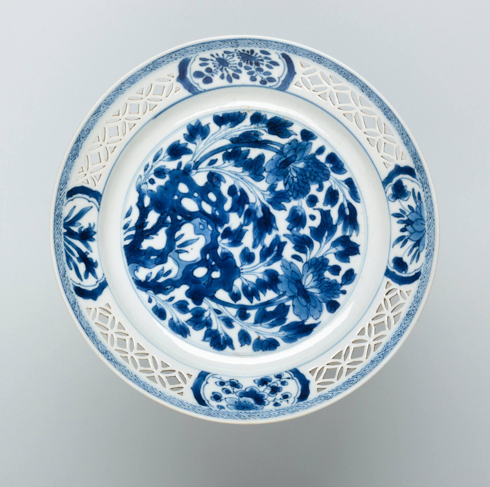 DescriptionBlue and white plate with perforated border; decorated with rock and peony spray.