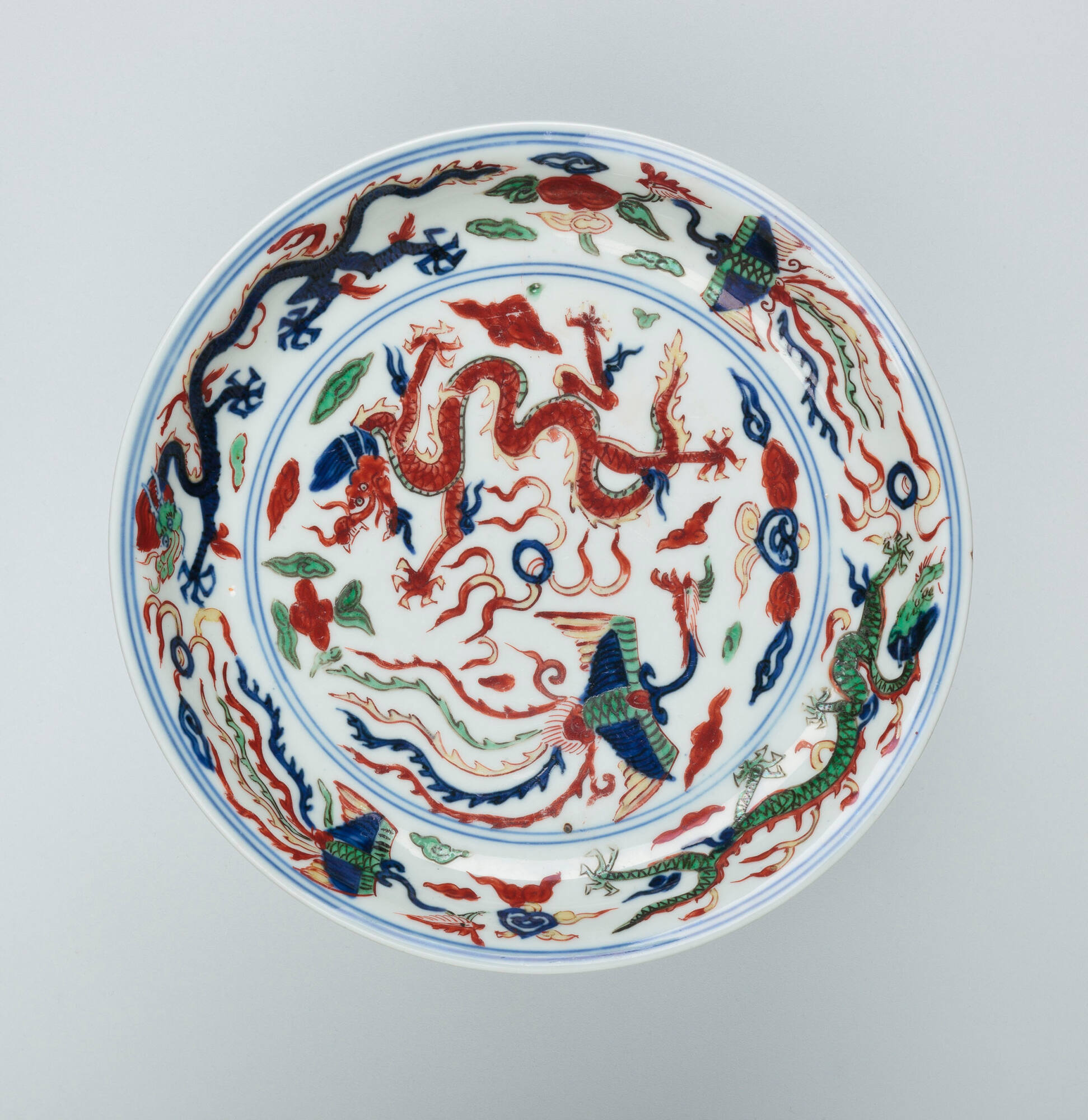 DescriptionEnameled design of dragons, phoenixes, clouds, etc., in red, green, blue and yellow underglaze