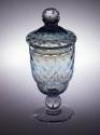 DescriptionBlue threads blown into clear glass - quilted pattern. Bubble ball stem.