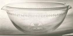 DescriptionTwo pouring lips; engraved vine-leaf band below rim; body decorated with an earl's coronet and a monogram within a beaded oval; beaded band around the base.