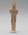 DescriptionStylized standing female figure with angular, bird-like head. The lower part of the body is a flat rectangle on a splayed foot. The arms and hands with articulated fingers are raised to her chest as if cupping her breasts. Around the neck is a two-strand necklace marked with sharp diagonal cuts in the clay. The eyes are made of double discs of applied clay coils with a pierced center. A headdress, or plaited hair, includes locks hanging down the sides of the neck and a coil of hair on the back of the head.