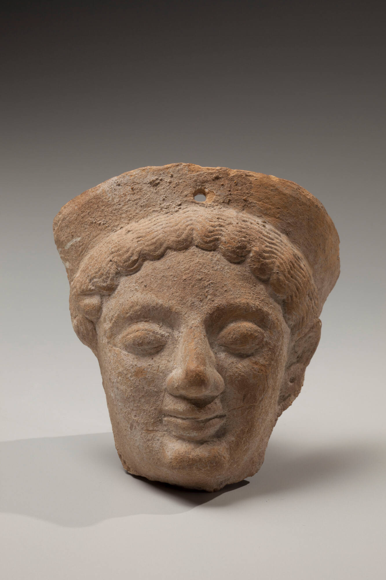 DescriptionThis hollow terracotta fragment depicts the head of a female figure, broken at the neck. The object was produced from a mold and then hand-finished. The figure wears a tall, cylindrical headdress known as a polos, which has a single perforation in the center, presumably for suspension. Her hair is parted in the middle and arranged in shallow waves. The face is oval, with almond-shaped eyes set at an oblique angle and full lips curved into a distinct "Archaic smile".