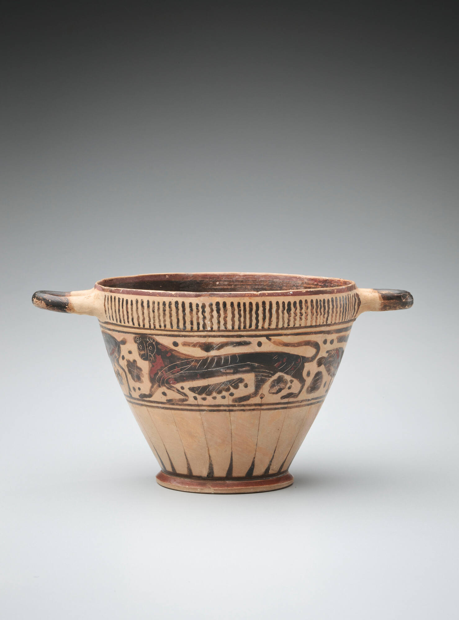 DescriptionThis skyphos is painted in black figure technique with two panthers with elongated bodies, a goat, and a bird, with rosettes and dots in the background.