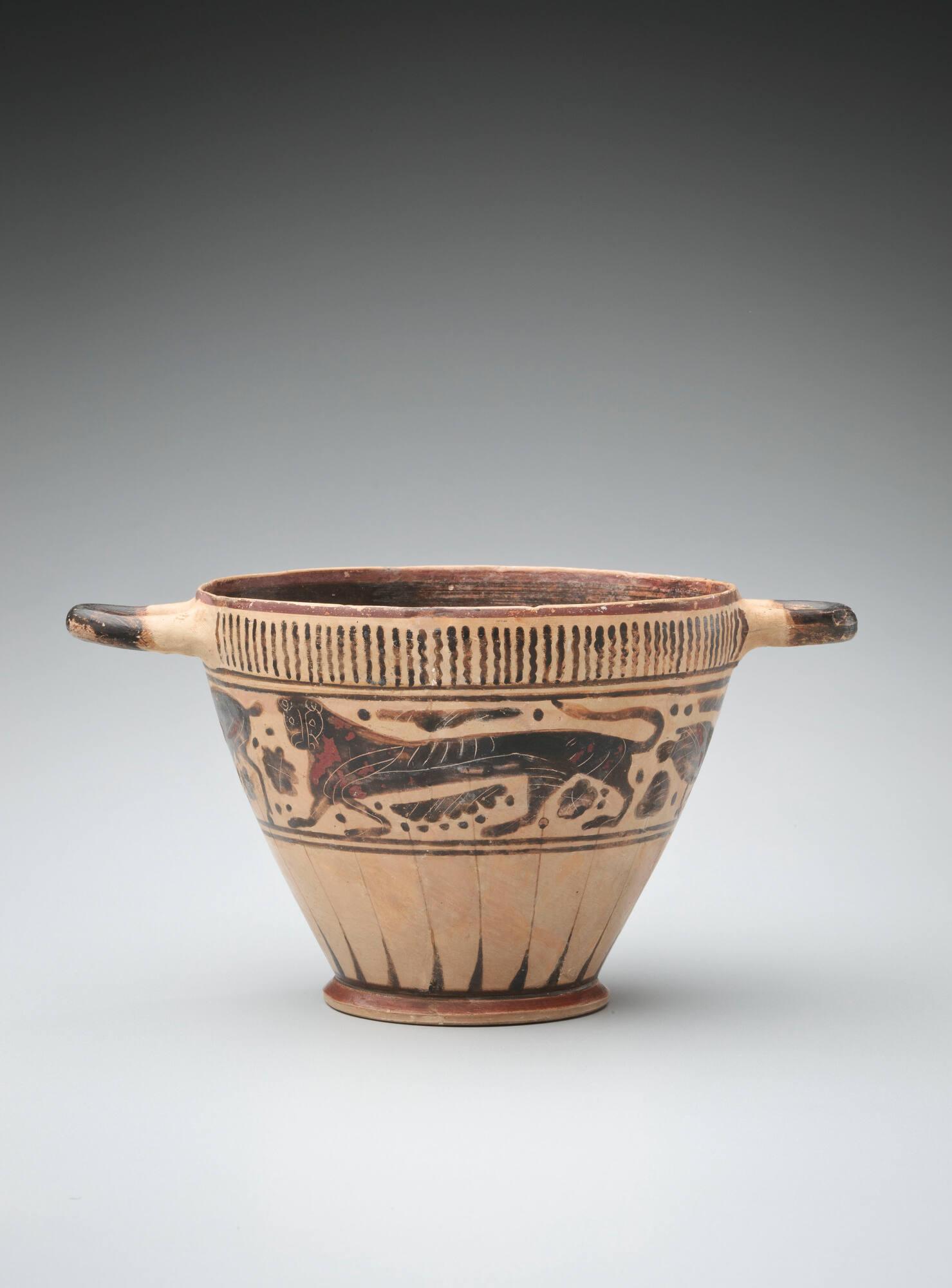 Label TextThis deep, two-handled wine cup, known as a skyphos, was produced in Corinth, a powerful Greek city-state that dominated the pottery trade in the 7th and 6th centuries B.C. The vessel features the "black-figure" technique, where figures are painted in dark slip against the pale clay, with details incised (cut) into the surface.