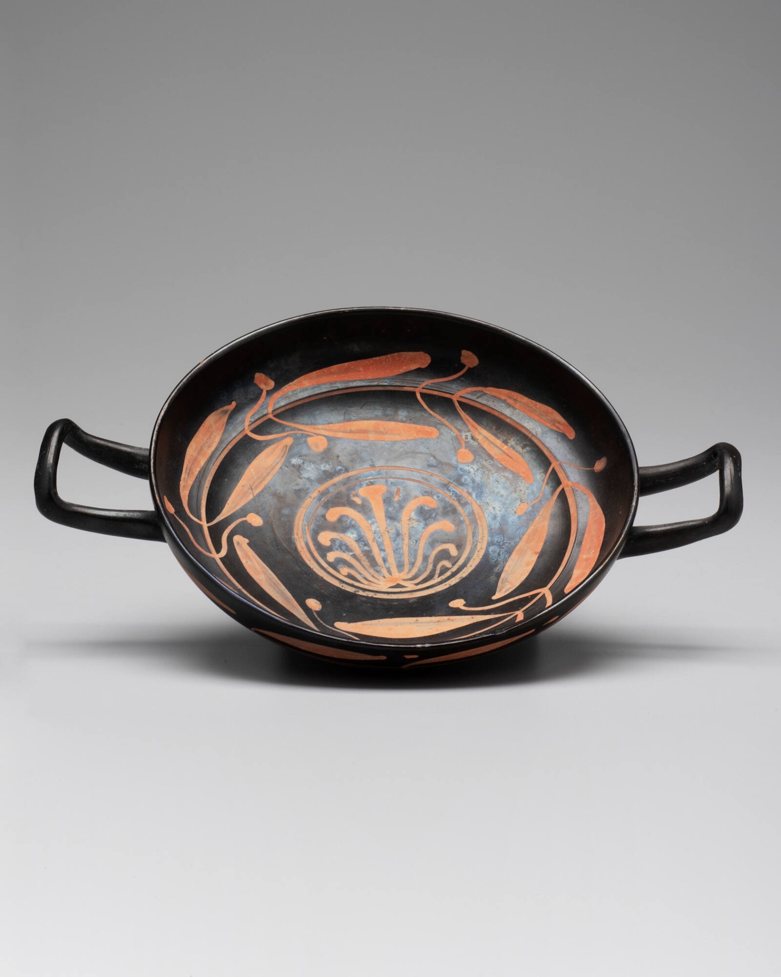 DescriptionThe interior is painted with a wreath of laurel leaves and berries around a 9-leaf palmette in the tondo.