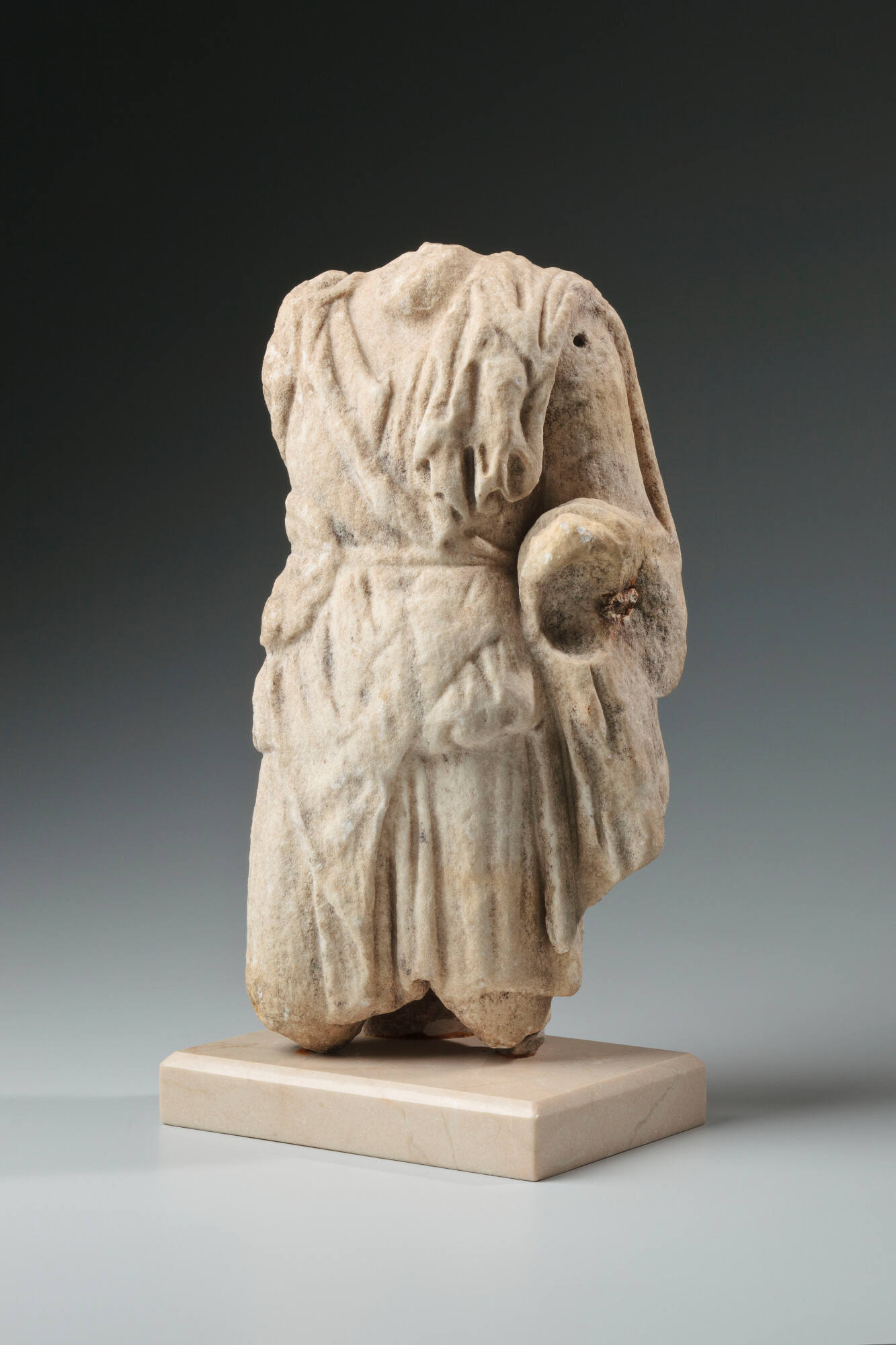 DescriptionThis fragmentary white marble statuette depicts a standing male figure wearing a short, knee-length chiton (tunic) belted at the waist. A nebris (animal skin) is draped diagonally across the torso from the right shoulder to the left hip, secured by a knot. A heavy mantle (himation) is draped over the left shoulder and wrapped around the left arm, falling in deep, vertical folds along the side of the body. The drapery is carved with deep drill channels creating thick, voluminous folds that cling to the underlying form. The figure is missing the head, the right arm from the shoulder, the left hand, and the legs below the knees. The back is finished but less detailed than the front.