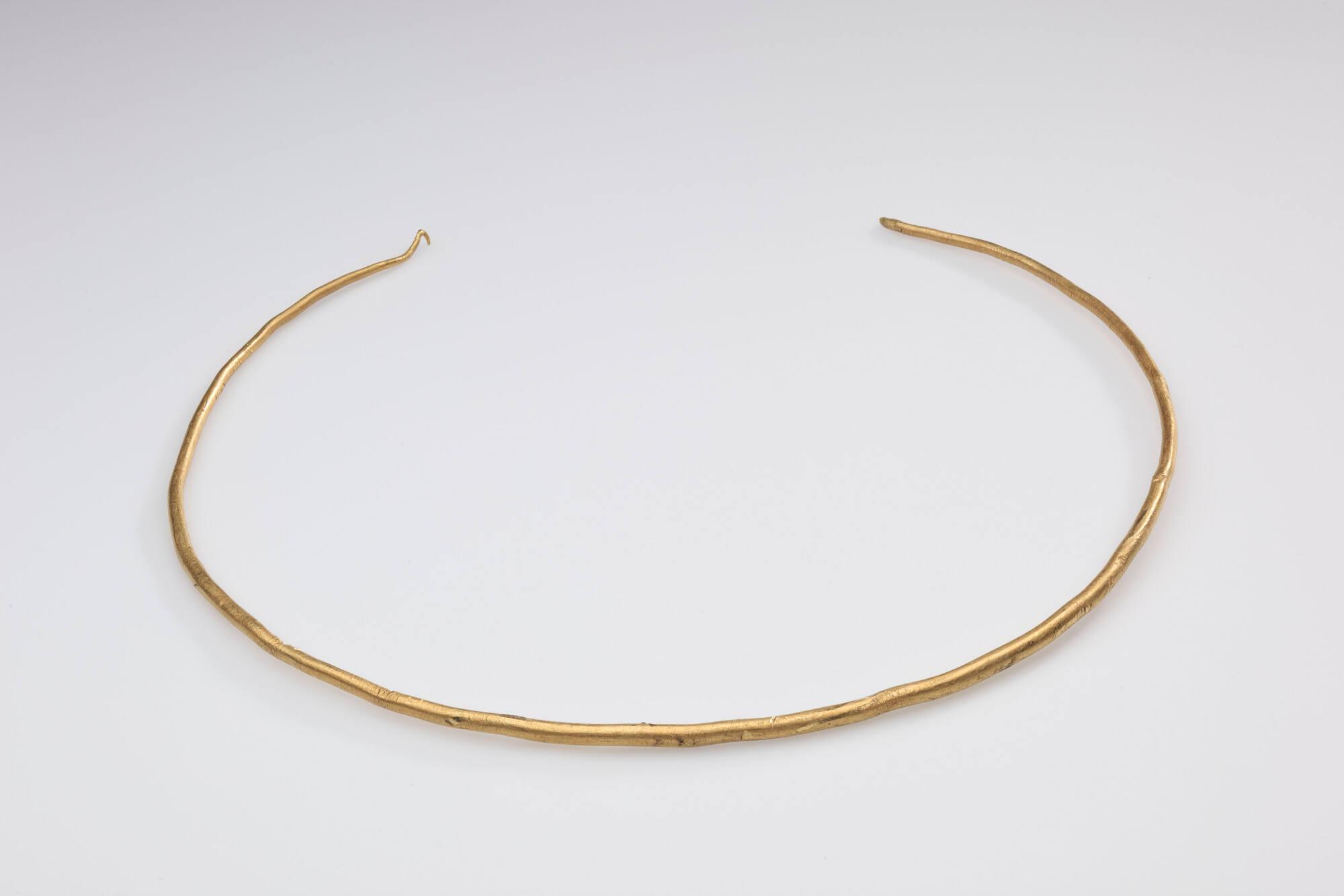 Label TextThis gold neck ring, or torc, was discovered in 2001 by metal detectorists in a muddy field in Northern England (Cantley, Yorkshire). While often associated with the later "Celtic" tribes of the Iron Age, gold torcs were actually first worn in Britain over a thousand years earlier, during the Bronze Age. Simple and elegant, this band is made of 81% pure gold. It would have been worn by a high-status individual as a symbol of power and prestige. The single hook terminal suggests it once clasped shut, likely with a matching loop that is now lost. Though buried for three millennia, the metal remains as bright as the day it was worn.