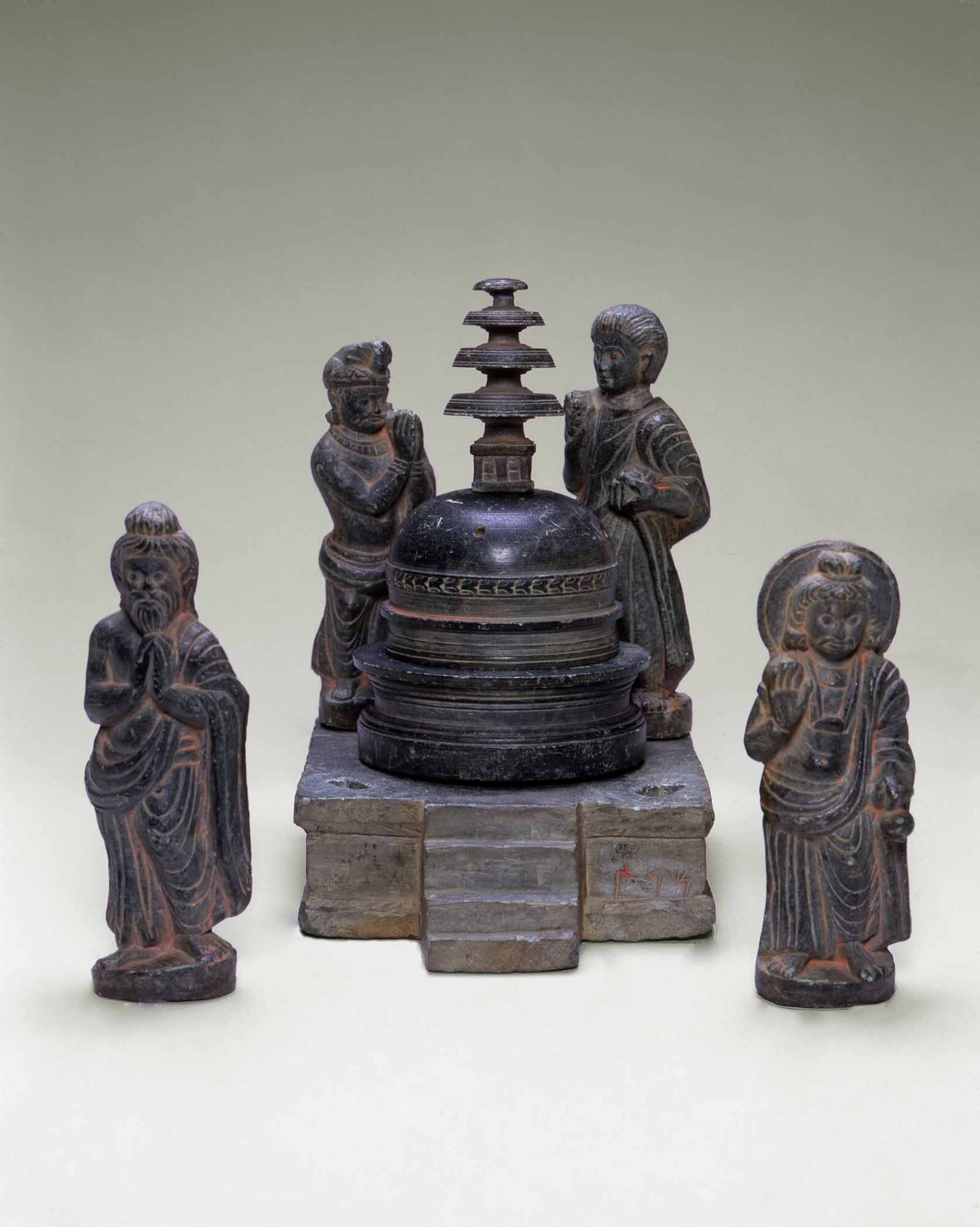 Label TextThe prime object of veneration for Buddhists is a stupa, or funerary shrine, which refers to the original mounds where Buddha’s earthly remains were buried. Full of cosmic symbolism, the stupa (meaning “crown of the head” or “summit”) symbolizes the mind of the Buddha. The various parts of the stupa correspond to the five elements of manifested existence: space/void, wind/air, fire, water, and earth. The domed shape also refers to the dome of the heavens. The spire rising from the middle represents the axis of the world. This rare model of a stupa is encircled by a donor and three holy figures (deities Brahma and Indra, who were adopted from Hinduism, and Maitreya, the Buddha of the Future). It is believed to be a traveling shrine because the pieces can easily be assembled and taken apart again.Published ReferencesJ. Sherrier, "An Important Relic Stupa with Four Freestanding Figures," South Asian Archaeology, 1984, pp.254-256.2nd - 3rd centuries