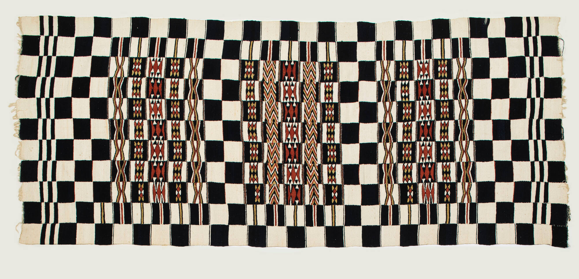 DescriptionEleven, four inch wide woven strips sewn together. Warps are cotton and wefts are wool and cotton blocks. Three central patterns of diamond and zig-zag blocks between bands of checkerboard-pattern bands.