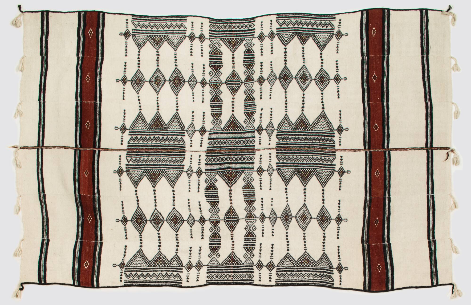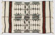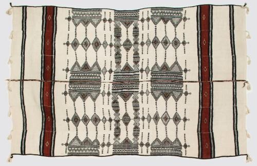 DescriptionWoven in two panels, sewn together of three, nine inch wide woven strips. Seven tassels at top and bottom. Panels embroidered together with red, black and white wool yarns.