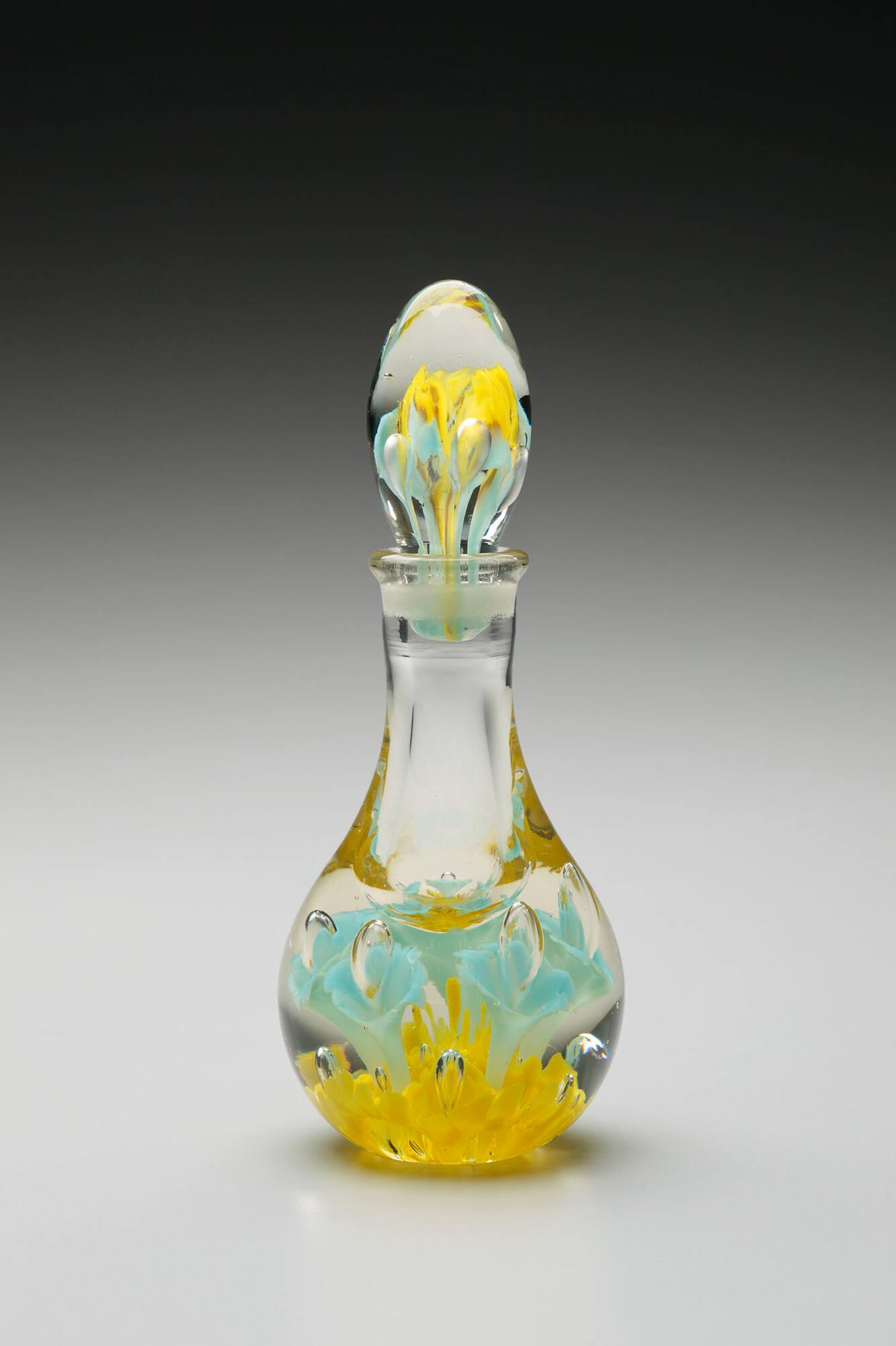 DescriptionYellow bottom, air bubble centers on blue petals; with stopper.