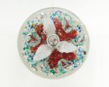 DescriptionSix bubble base with interior base of small multi-color glass shards in red veils, three petal white flower with air bubble center