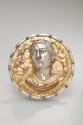 DescriptionThe object consists of two main parts: a central silver disc and an outer silver frame. The disc was worked freehand in repoussé from both sides to create a high-relief portrait bust of an emperor emerging from an acanthus calyx. The background is decorated in low relief with a hunt scene—a lion, a boar, and three dogs—and the entire ground is covered with fine stippled patterns. Key details on the portrait, armor, animals, and background are gilded. The outer frame is made of a heavier band of silver and is attached to the disc with sixteen silver rivets. The reverse shows evidence of two ancient rectangular patches, which are standard workshop repairs.