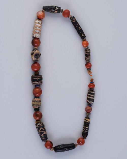 DescriptionForty-seven beads made of enameled glass, strung with carnelian beads.
