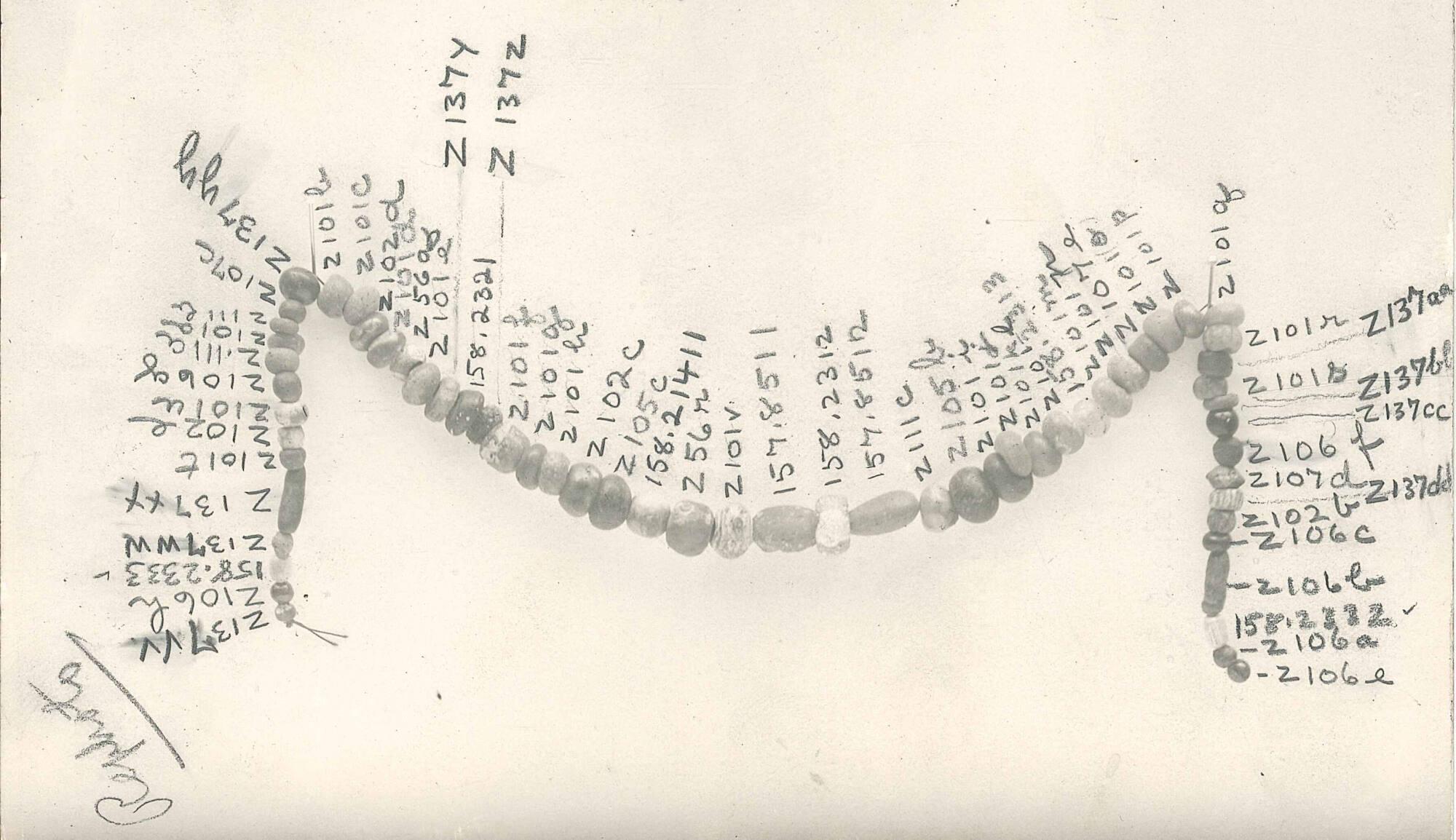 DescriptionNecklace composed of sixty-one beads made of glass and faience.