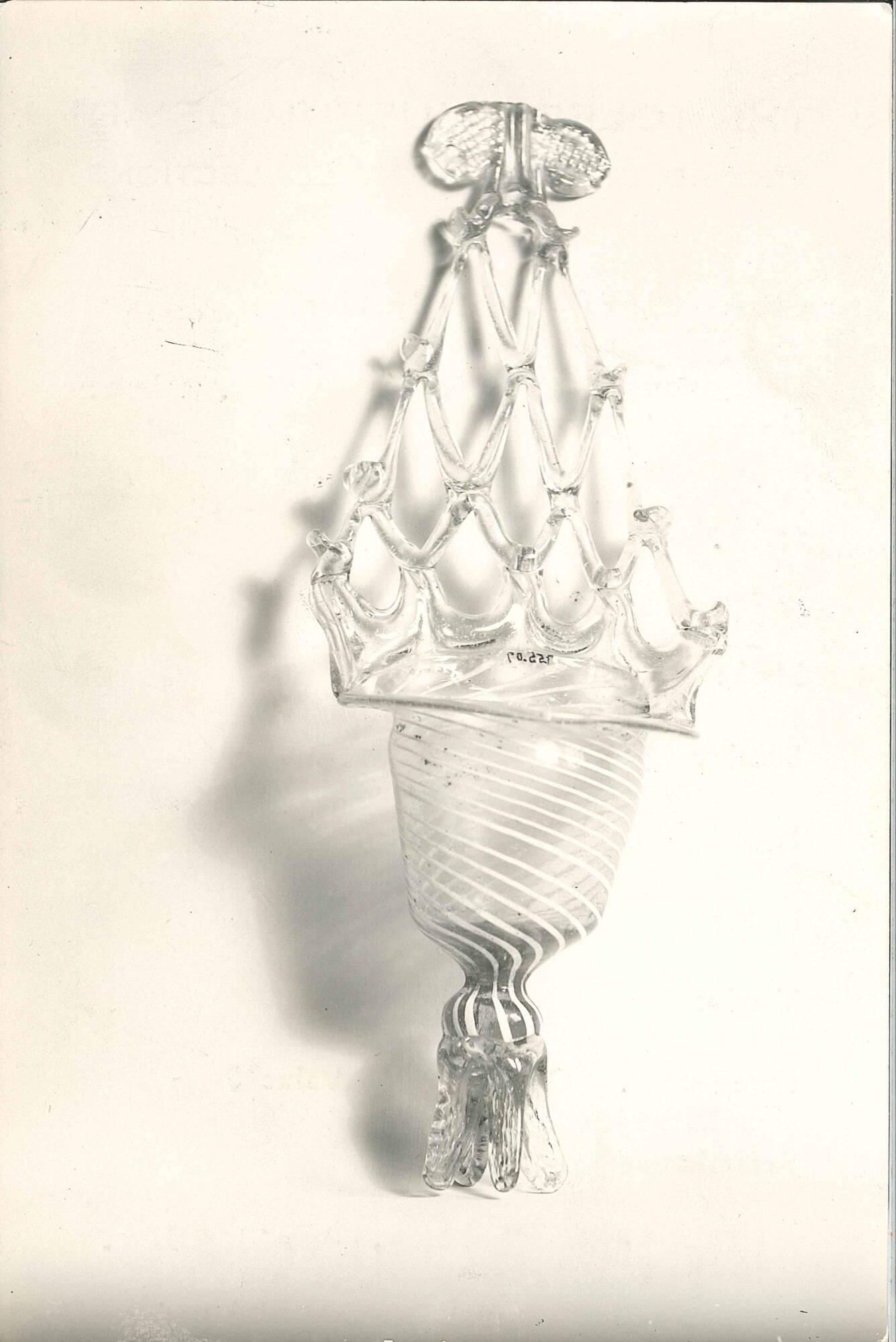 MediumClear glass with spiral "latrino" or opaque white glass decoration and perforated net-like back for suspension.
