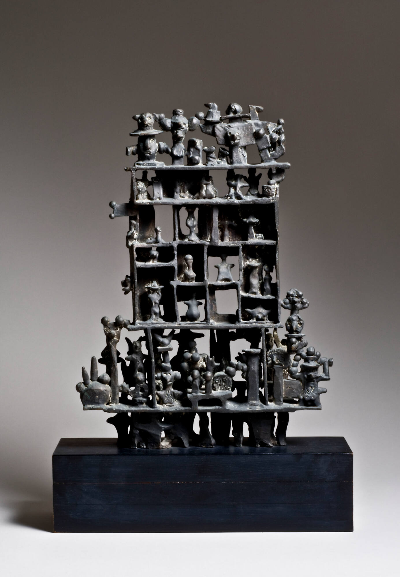Label TextMarisol created Figuras at a pivotal moment in her career. A French émigré to the United States, Marisol studied painting in Los Angeles and New York before transitioning to the production of sculpture in her late twenties. Figuras represents one of these early sculptural experiments. The sculpture’s multiple compartments probably were meant to evoke Mexican boxes filled with religious figures, a citation which speaks to the influence that both Latin American folk art and religion had on Marisol’s work (Marisol’s parents were Venezuelan). Although the compartments are arranged in rigidly linear registers, the figures, heads, and shapes within them are energetic combinations of round and pointed forms that draw the eye restlessly around the composition.Published ReferencesCollischan, Judy, Marisol, Purchase, Neuberger Museum of Art, Purchase College, 2001, repr.(col.), pl. 2, p. 27.