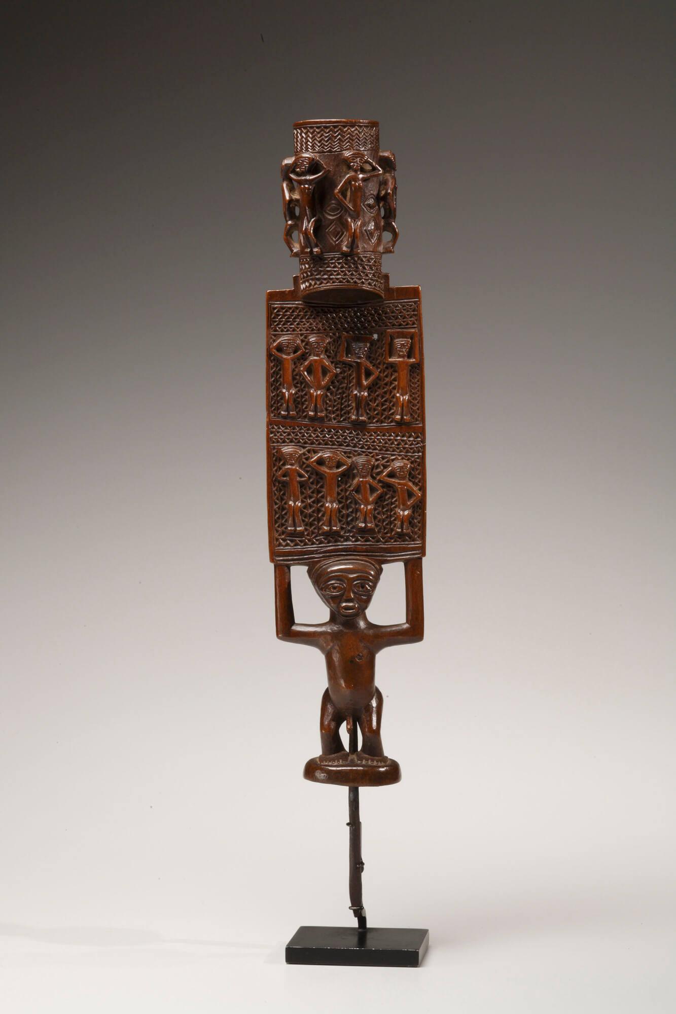 DescriptionStaff: Cylindrical tobacco container carved from a single piece of wood, supported on a metal spike. A three-dimensional male figure supports a large flat rectangular panel carved in low relief on all sides with eighteen figures in various poses, which in turn supports a hollowed-out cylindrical vessel carved in high, openwork relief with six figures (see discussion of iconography)