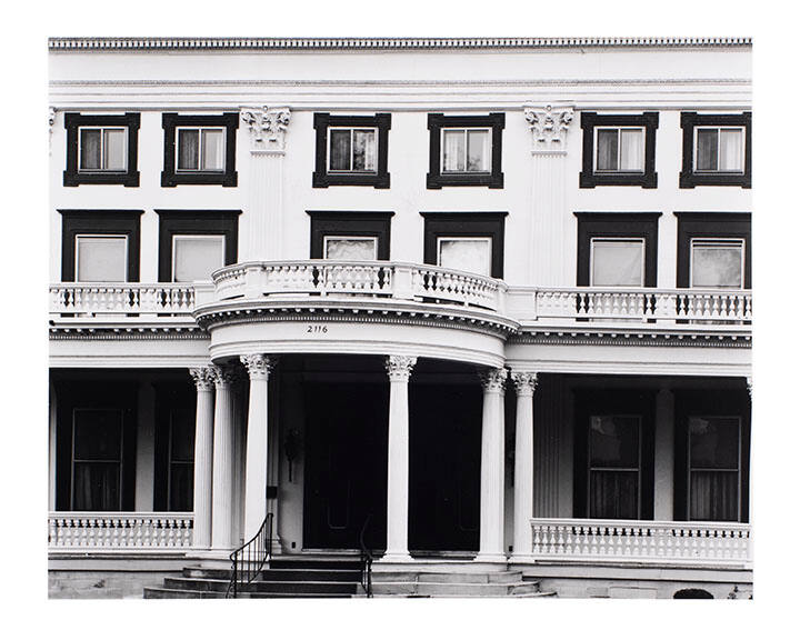DescriptionFacade of 3-story white building with colonnade entrance. Above the front door is the number: 2116.
