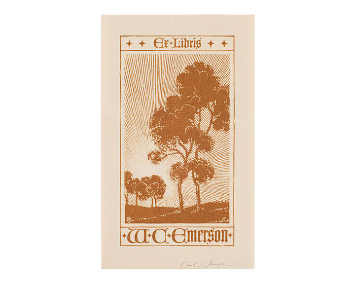 Mediumzinc etching. Drawing made with Chinese white painted on a black ground after the manner of a wood-cut. Printed in sepia.