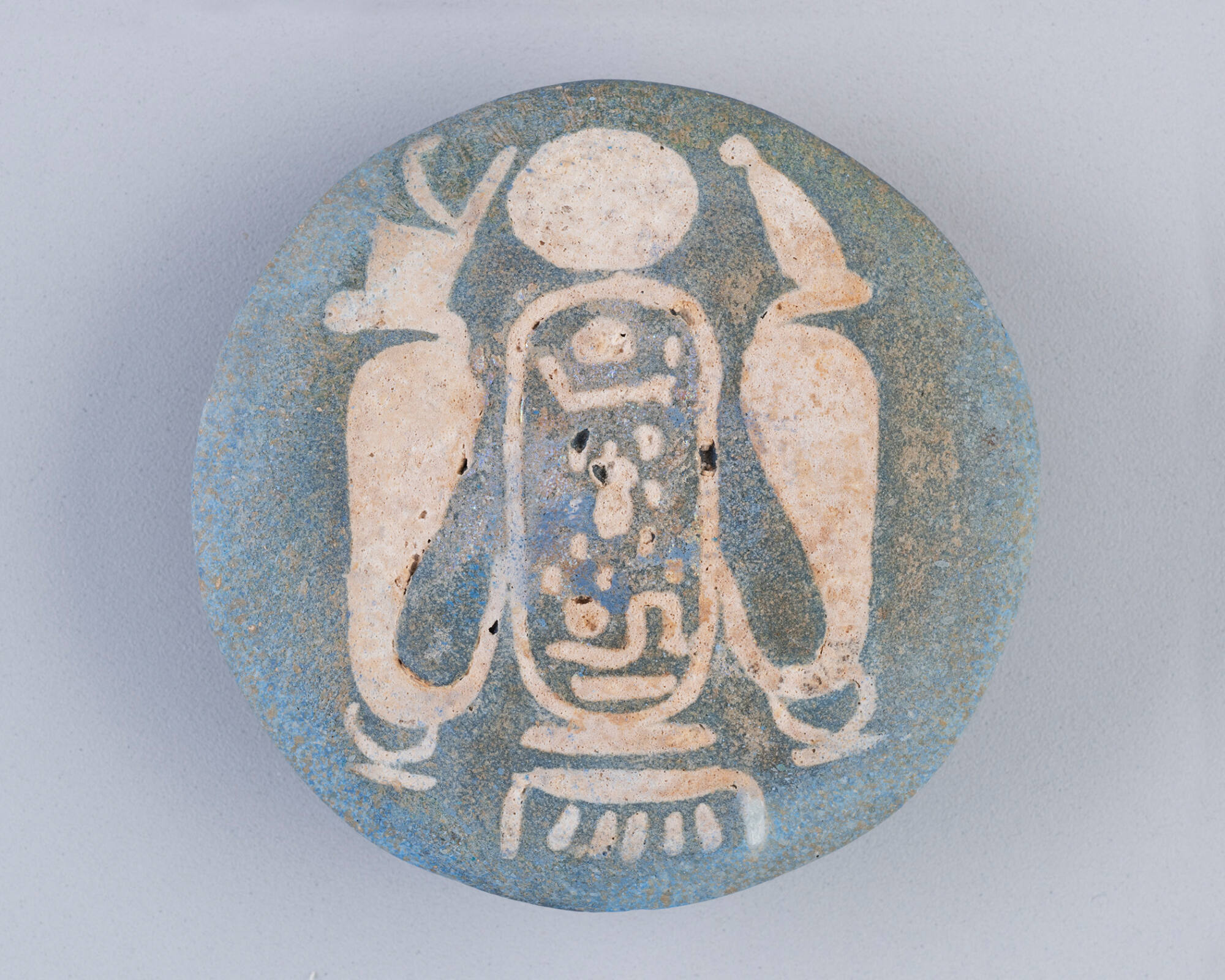 Label TextThis blue faience knob bears the throne name of Horemheb, the last ruler of Egypt’s 18th Dynasty, who restored religious and political order after the disruptions of the Amarna period. The surrounding motifs—symbols of gold, life, and the crowns of Upper and Lower Egypt—reinforce his claim to divine authority and national unity. Affixed to a coffer or small chest, the knob served a functional and symbolic role. A cord would have been looped around this and a paired knob to fasten the lid shut, sometimes with a clay seal impressed over the tie to ensure protection. Similar knobs were found in the tomb of Tutankhamun, suggesting a shared practice among Egypt’s royal elite for securing valuable or sacred contents.Published References(Godwin, Blake More and Molly Ohl Godwin), Catalogue of Egyptian Antiquities, Toledo Museum of Art, 1917, p. 22, no. 200.