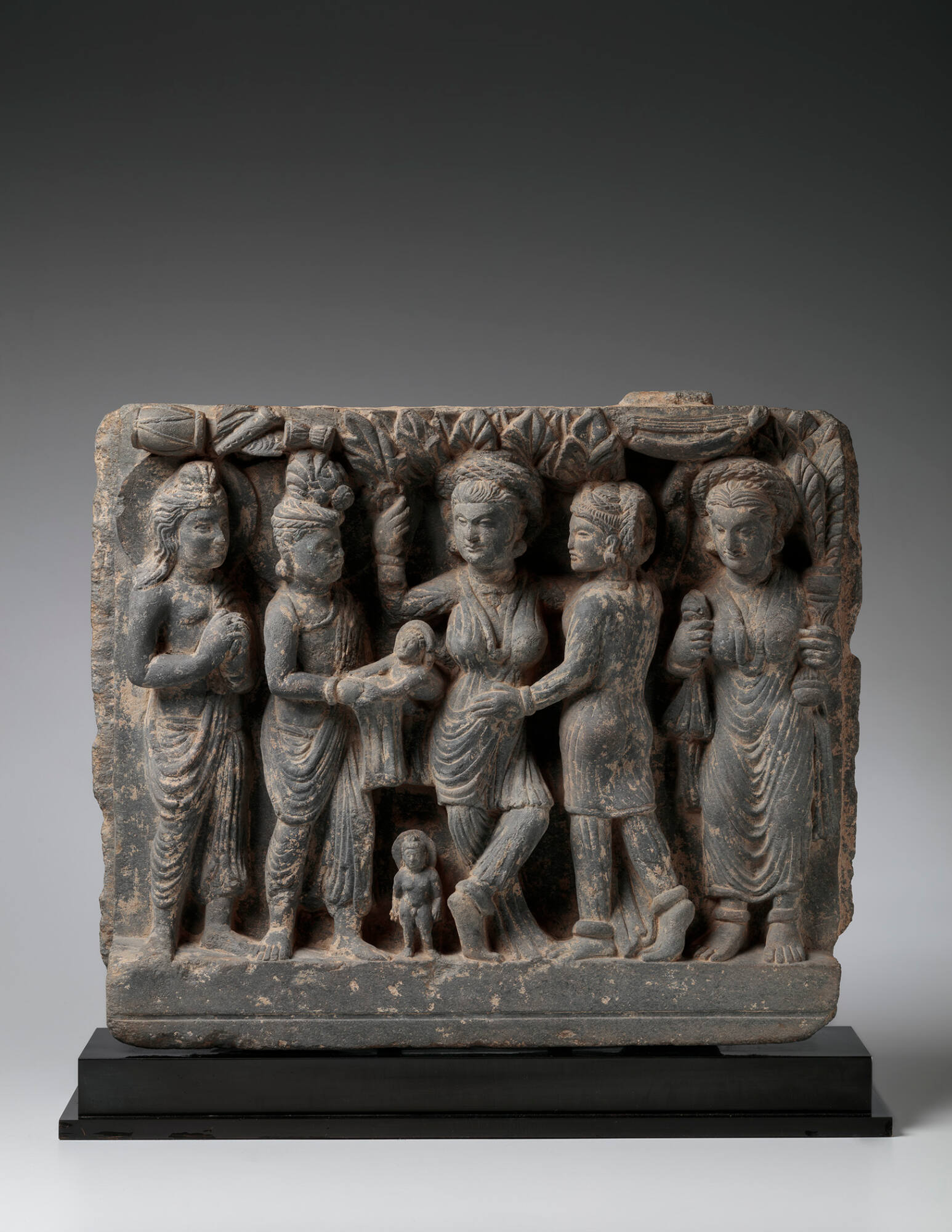 DescriptionA grey schist relief of the jataka relating the birth of the Buddha, Siddhartha from the area of Gandhara (modern day Pakistan). Most likely was at one time part of a stupa's complex decoration.