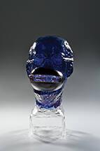 DescriptionThe hollow sculpture is blown of colorless glass in a two-part mold forming the head, neck, and square base of the portrait head. The mold seam remains visible as a relief line separating the front and back of the head. Once the molded glass shape is removed from the form, a large blob of molten glass is added to the area of the mouth and quickly blown out to a bubble. Once cooled, the head's square base rim is ground flat and the mouth bubble engraved with the words in capital letters 'Technique is dear" surrounded by straight lines forming a rectangle resembling a plaque. The head and neck of the sculpture is finally painted overall with noticeable brush strokes in dark blue and brown enamel paint. The inscription and framing line are gilded with gold leaf, leaving some of the red sizing visible beneath.