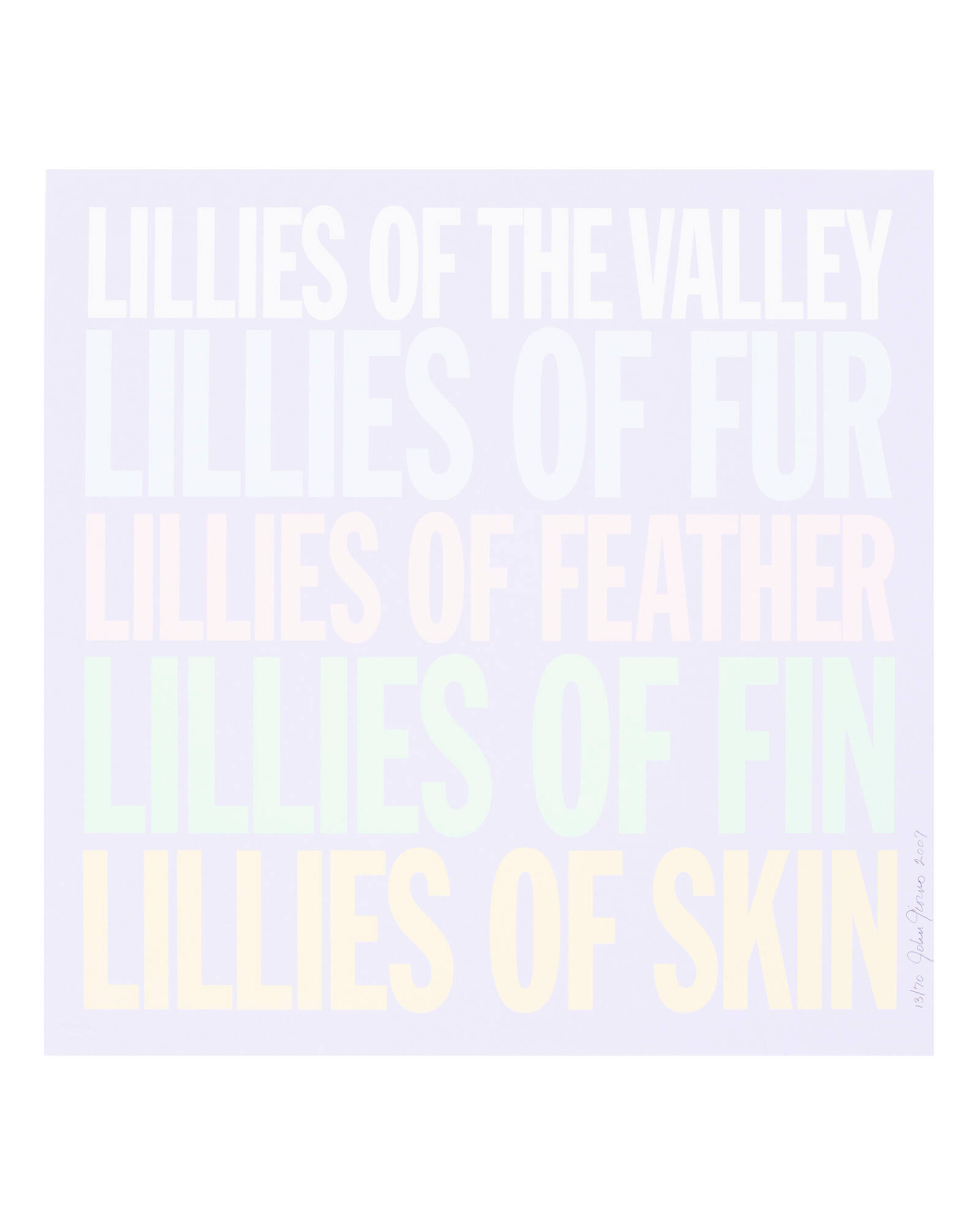 Label TextJohn Giorno, one of the leading lights of the New York beat generation, devised the legendary event at the Museum of Modern Art in 1970, during which different poems could be listened to everyday on answering machines. The LP produced later, entitled The DIAL-A-POEM Poets, features the highlights from among 700 poems by 55 poets. The Giorno Poetry System record label artist collective he founded in 1965 focused on the innovative use of new technologies. In Welcoming the Flowers Giorno combines lines of poetry with beautiful color and typography to make an unexpectedly rich visual experience. Not attempting to “illustrate” the lines, Giorno instead lets the language become the imagery. Individually the prints are lusciously rich; all together they belie the idea that text-based art must be dry or visually uninteresting.Exhibition HistoryTMA, Word Play (October 16, 2009- February 7, 2010)