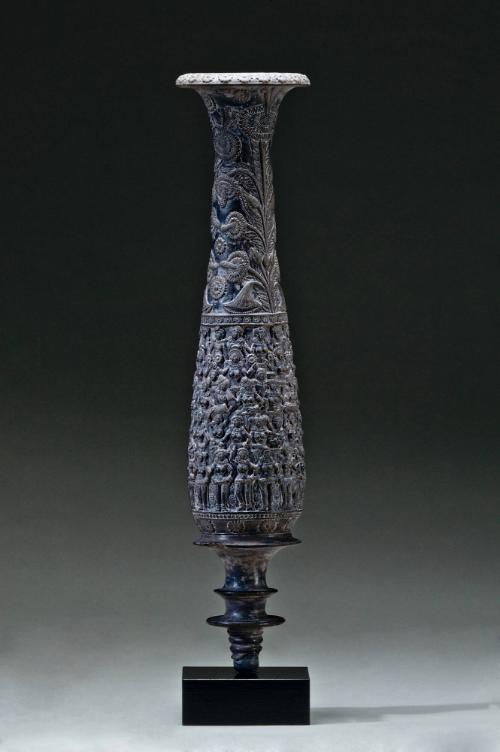 Label TextThe lower register of this ancient vase—below the bold design of lotus flowers—depicts rows upon rows of yakshas and yakshis, male and female nature divinities representing the bounty of the earth. They all wear elaborate jewelry, and many are carrying musical instruments, flowers, sheaves of grain, and laden baskets—all of which are blessings of the goddess of wealth and fortune, Sri or Lakshmi. The vessel may have been “planted” in the ground during harvest festivals and rituals, as a purna kalasha, or “vase of plenty.” Such vases were used as an offering to ensure the fertility of the earth.Published ReferencesToledo Museum of Art, Toledo Museum of Art Masterworks, Toledo, 2009, p. 27, repr. (col.).Comparative ReferencesSee also Body, Speech and Mind, Asian Religious Images, Marcel Nies Oriental Art, Antwerp, 2006. See also Life and Art of Chandraketugarh, State Archaeological Museum, Behala, Kolkata, 2001.Early to Late 15th century