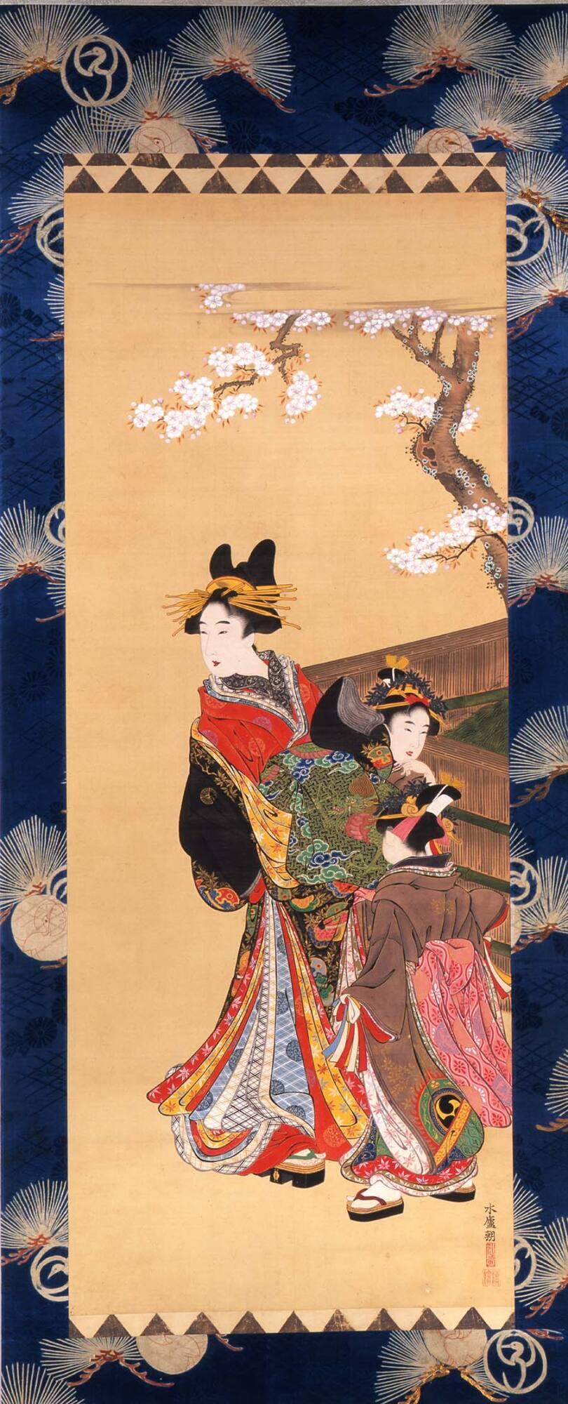 Courtesan and Two Kamuro Beneath a Flowering Cherry