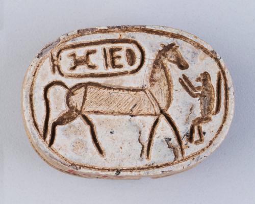 DescriptionThe seal’s design features a horse, a cartouche, and a baboon in a gesture of adoration. On the scarab-shaped reverse, the back is rendered naturalistically, with two lines separating the elytra (wing covers). The seal is pierced lengthwise for suspension or attachment. The original glaze has faded, appearing light brown on the upper surface and whitish on the underside.