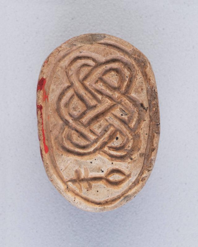 Label TextThe design on the underside of this seal combines a geometric knot with the hieroglyph nefer, which means "good," "beautiful," or "perfect." The woven rope pattern surrounding the sign symbolizes eternity or protection. During the Second Intermediate Period (the "Hyksos" era), such designs were extremely popular, blending decorative beauty with magical function to ensure good fortune for the wearer. The glaze on this piece has worn away, revealing the grey stone underneath.12th–18th Dynasties (1991–1292 BCE)