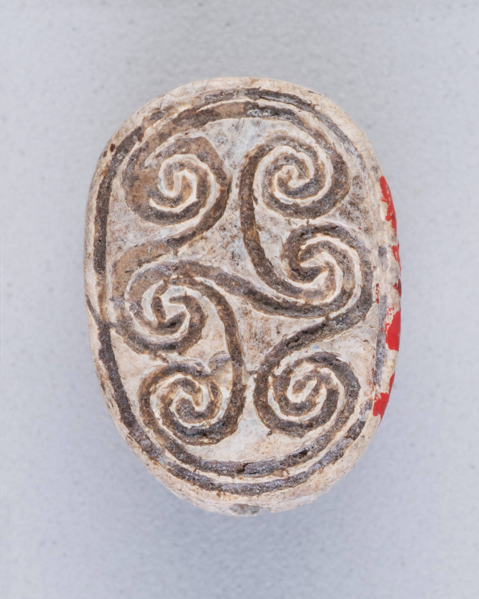 DescriptionA scarab-shaped seal carved from steatite. The back is of medium height and rather flat. The head merges directly into the prothorax without a dividing line, but prominent eyes are visible. Slight nicks at the sides distinguish the prothorax from the elytra (wing cases), though there is no suture line dividing the wing cases themselves. The legs are rendered summarily and flatly, though the three pairs are differentiated; striations are visible on the outer surface of the front legs and just behind the nicks. The object is pierced lengthwise. The original glaze has deteriorated, leaving a powdery white substance in the depressions (likely remains of blue glaze). The base features an incised scroll design.