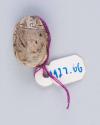 DescriptionA scarab-shaped seal carved from steatite. The back features a high prothorax with a straight horizontal cutting separating it from the head. The elytra (wing cases) are not divided by a suture line, though very slight nicks at the sides indicate the separation between the prothorax and elytra. The legs are coarsely indicated in relief with well-defined pairs; striations appear only on the upper surface of the front pair. The ground between the legs is cut away only slightly. The object is pierced lengthwise. The original glaze has deteriorated to a light gray-brown. The base features a deep intaglio design with cross-hatching.