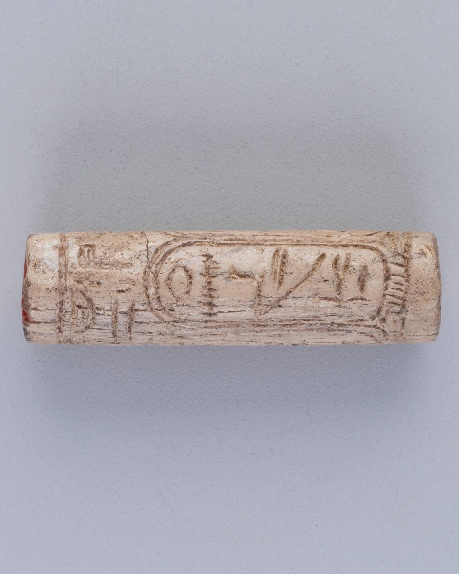 Label TextThis cylindrical steatite seal is inscribed with the titles and three cartouches of Amenemhat III, a significant ruler of Egypt’s Middle Kingdom, known for stabilizing the economy and commissioning major building projects, including the famed Labyrinth at Hawara. The inscription identifies Amenemhat III by his throne name Nematre: “King of Upper and Lower Egypt, Nematre, Good God, Lord of the Two Lands, Nematre, Son of Re, Amenemhat.” These titles emphasize the king’s divine authority, his role as the unifier of Egypt, and his connection to the sun god Re.19th Dynasty (1292–1189 BCE)